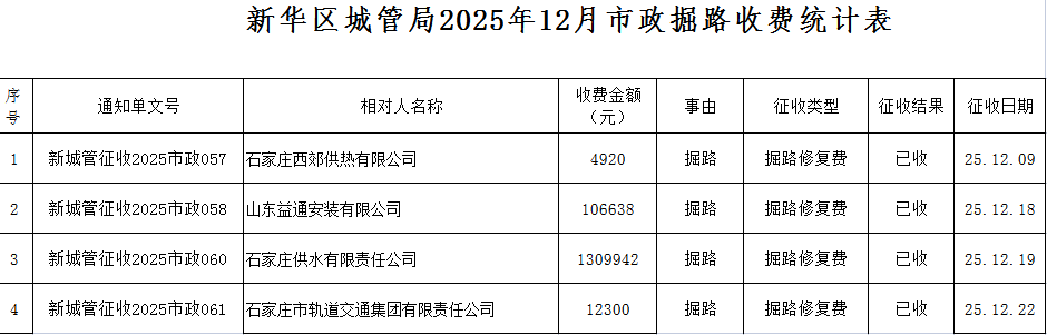 新华区城管局2025年12月市政掘路收费统计表