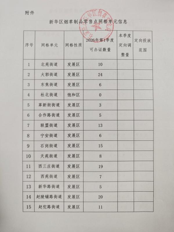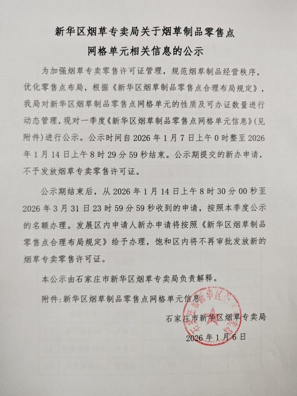 新华区烟草专卖局关于烟草制品零售点网格单元相关信息的公示(2026年一季度)