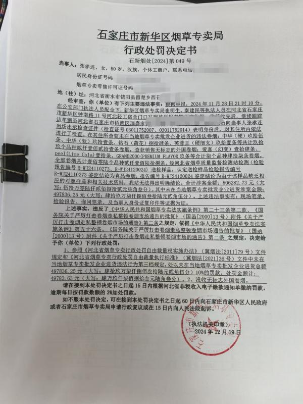 石家庄市新华区烟草专卖局行政处罚决定书[2024]第049号