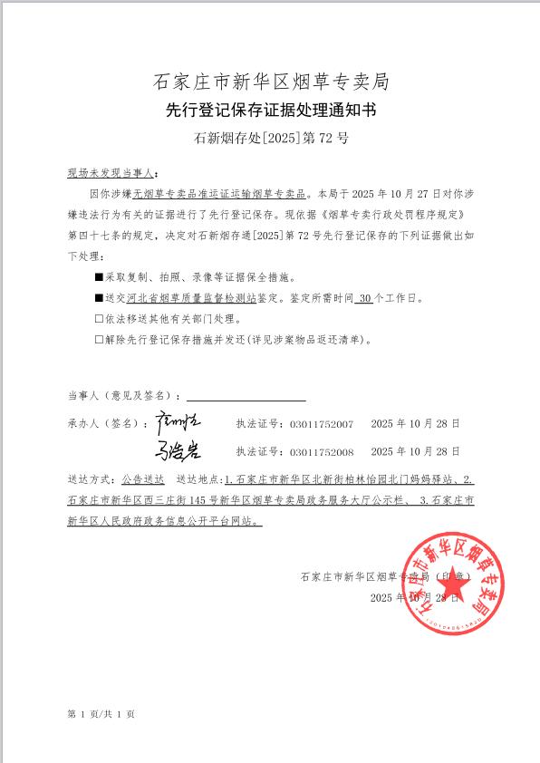 先行登记保存证据处理通知书石新烟存处[2025]第72号