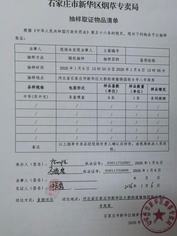 石家庄市新华区烟草专卖局抽样取证物品清单[2026]第4号
