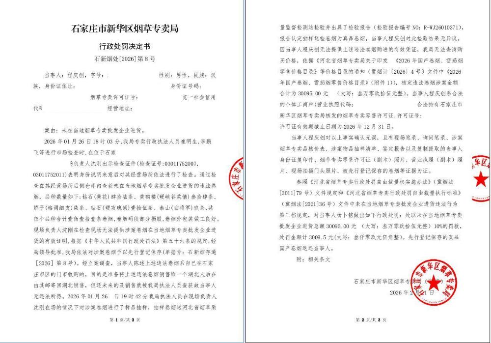 石家庄市新华区烟草专卖局行政处罚决定书[2026]第8号