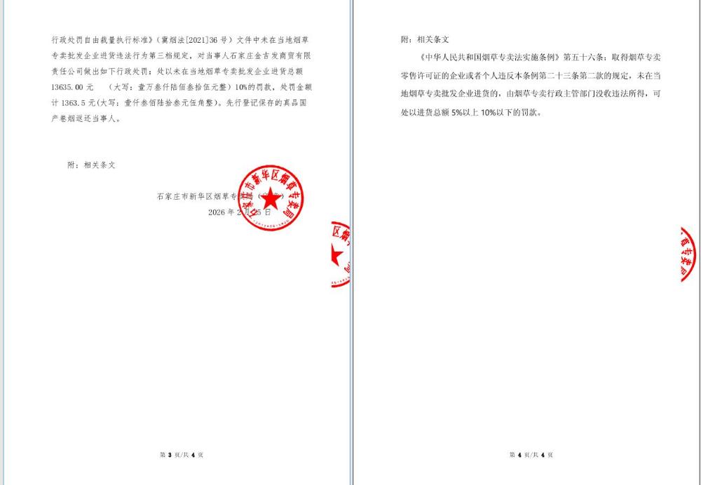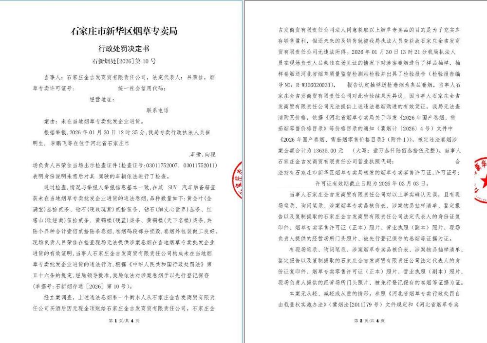 石家庄市新华区烟草专卖局行政处罚决定书[2026]第10号