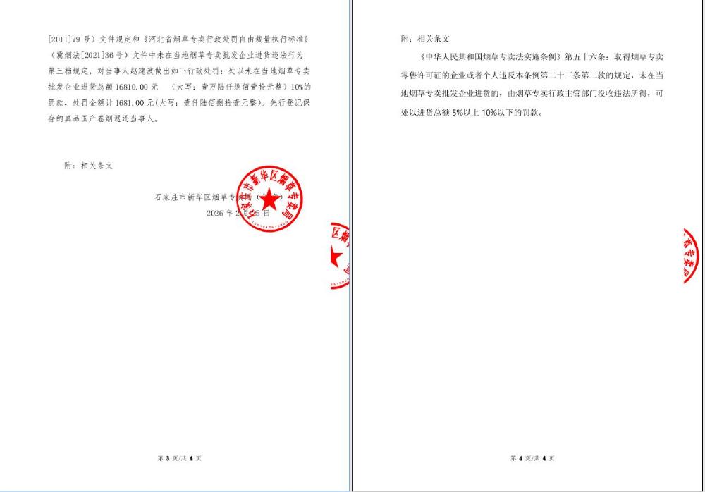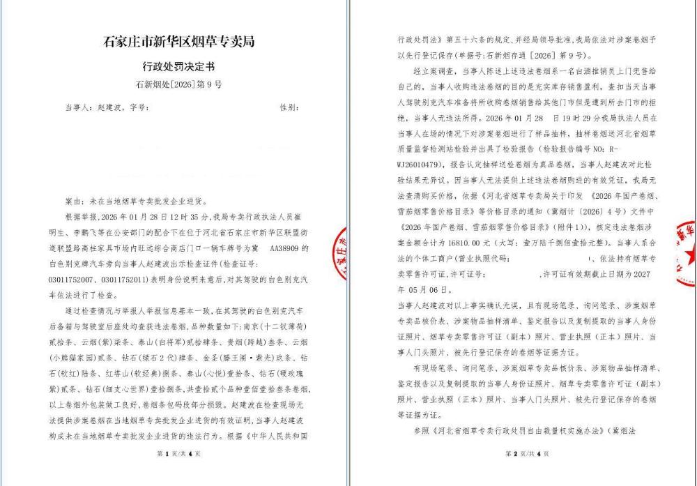石家庄市新华区烟草专卖局行政处罚决定书[2026]第9号
