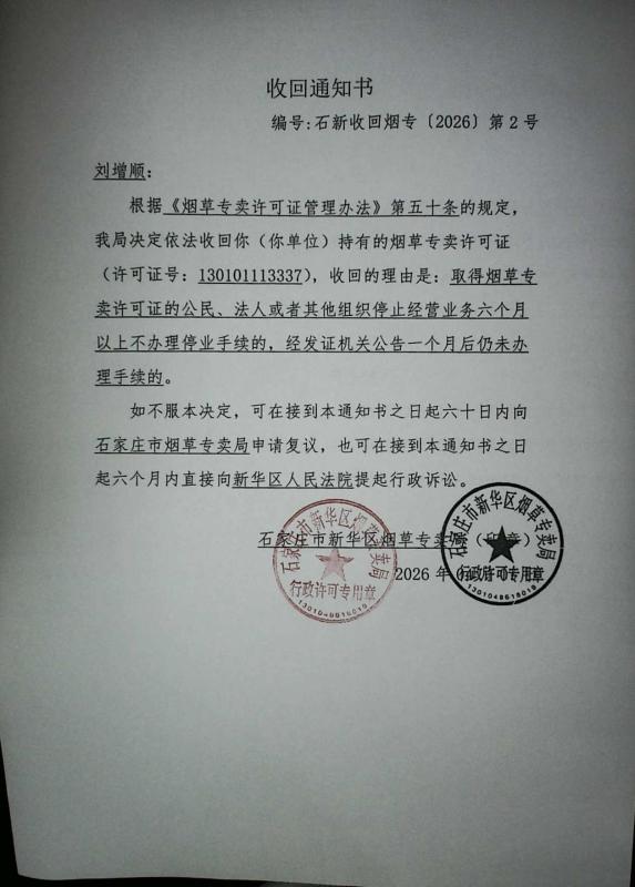 本局依据《烟草专卖许可证管理办法实施细则》第六十八条规定,作出收回你烟草专卖零售许可证(130101113337)的许可决定,现将《收回通知书》(石新收回烟专〔2026〕第2号)予以公告送达。