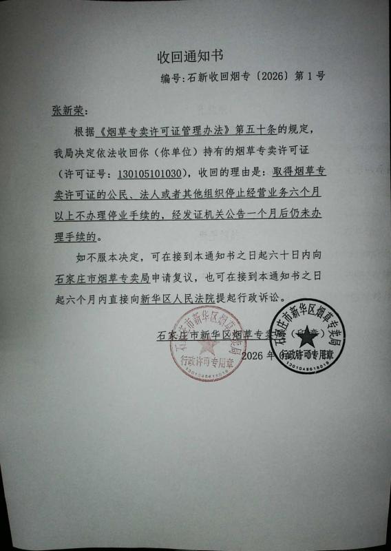 本局依据《烟草专卖许可证管理办法实施细则》第六十八条规定,作出收回你烟草专卖零售许可证(130105101030)的许可决定,现将《收回通知书》(石新收回烟专〔2026〕第1号)予以公告送达。